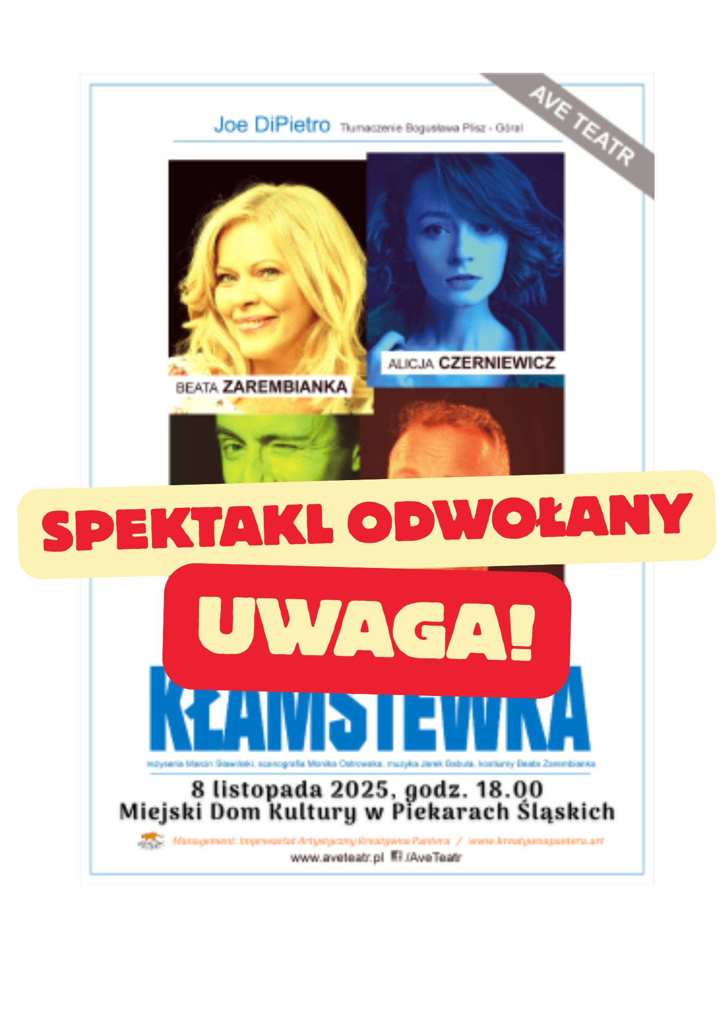 Piekary Śląskie ul. Bytomska 73Z przykrością informujemy, że zaplanowany na 8 listopada 2025 r. o godzinie 18:00 spektakl „Kłamstewka” został odwołany z przyczyn niezależnych od organizatora. Zwrot środków za zakupione […]